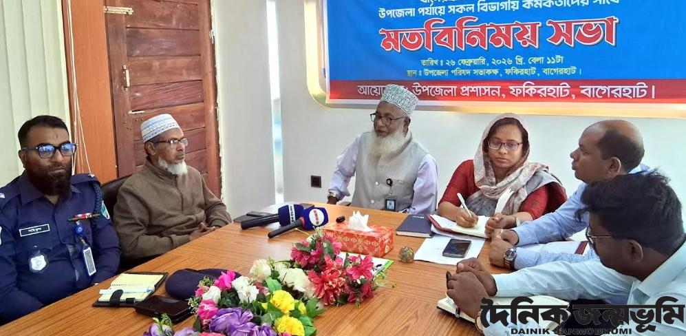 ফকিরহাট প্রতিনিধি: বাগেরহাট-১ আসনের সংসদ সদস্য অধ্যক্ষ মাওলানা মশিউর রহমান খানের সাথে ফকিরহাট উপজেলার সকল সরকারি দপ্তরের কর্মকর্তাদের সাথে মতবিনিময় সভা অনুষ্ঠিত হয়েছে। উপজেলা প্রশাসনের আয়োজনে বৃহস্পতিবার (২৬ ফেব্রুয়ারি) বেলা ১১টায় উপজেলা সম্প্রসারিত কমপ্লেক্স ভবনের মিলনায়তনে এই মতবিনিময় সভা অনুষ্ঠিত হয়। এসময় উপজেলা প্রশাসনের পক্ষ থেকে সংসদ সদস্যকে ফুলেল শুভেচ্ছা জানানো হয়। অনুষ্ঠিত সভায় সভাপতিত্ব করেন উপজেলা নির্বাহী কর্মকর্তা সুমনা আইরিন। এসময় সহকারী কমিশনার (ভূমি) শরীফ নেওয়াজ, উপজেলা মৎস্য কর্মকর্তা শেখ আসাদুল্লাহ, উপজেলা প্রকৌশলী মো: আজিজুর রহমান, থানার ভারপ্রাপ্ত কর্মকর্তা (ওসি) মো: সাইফুল ইসলাম, উপজেলা মাধ্যমিক শিক্ষা কর্মকর্তা মো: গোলাম মোস্তফা, প্রাথমিক শিক্ষা কর্মকর্তা শোভা রায়, প্রকল্প বাস্তবায়ন কর্মকর্তা ইমরুল কায়েস, বাংলাদেশ জামায়াতে ইসলামীর ফকিরহাট উপজেলা শাখার আমির মাওলানা এবিএম তৈয়াবুর রহমান, সেক্রেটারী শেখ আবুল আলা মাসুম, অধ্যাপক মোফাজ্জল হোসেনসহ বিভিন্ন দপ্তরের কর্মকর্তারা উপস্থিত ছিলেন। মতবিনিময় সভায় মাদক ও আইনশৃঙ্খলা বিষয়সহ বিভিন্ন বিয়য়ে আলোচনা করা হয়। এসময় সংসদ সদস্য অধ্যক্ষ মাওলানা মশিউর রহমান খান সরকারি দপ্তরের কার্যক্রম সম্পর্কে খোজ-খবর নেন। এছাড়া তিনি এদিন সকাল ১০টায় ফকিরহাট বাজারে নিজ ঝাড়ু হাতে নিয়ে পরিস্কার পরিচ্ছন্নতা কার্যক্রমে অংশগ্রহন করেন।