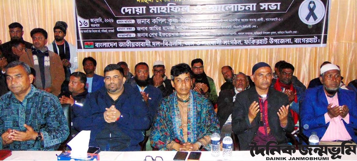 ফকিরহাট প্রতিনিধি : বাগেরহাটের ফকিরহাট উপজেলা বিএনপি ও সকল অঙ্গ সংগঠনের উদ্যোগে তিনবারের সাবেক সফল প্রধানমন্ত্রী মরহুমা বেগম খালেদা জিয়ার রুহের মাগফিরাত কামনা করে দোয়া মাহফিল ও স্বরণ সভা অনুষ্ঠিত হয়েছে। শুক্রবার (১৬ জানুয়ারী) বিকেল ৫টায় মুলঘর সরকারী উচ্চ বিদ্যালয় মাঠে এই দোয়া অনুষ্ঠানের আয়োজন করা হয়। উপজেলা বিএনপি নেতা শেখ ইফতেখার আহেম্মদ পলাশের সভাপতিত্বে অনুষ্ঠানে প্রধান অতিথি ছিলেন বাগেরহাট-১ আসনের বিএনপি মনোনিত প্রার্থী কপিল কৃষ্ণ মন্ডল। প্রধান বক্তা ছিলেন ইভেন্ট ও প্রকাশনা উপ-কমিটি এবং বিএনপির রিসার্স সেলের আহবায়ক আমীর আমজা শাথিল। উপজেলা স্বেচ্ছাসেবকদলের আহবায়ক কাজি মইন উদ্দিন মেরুর সঞ্চালনায় এতে আরো বক্তব্য রাখেন বিএনপি নেতা মোড়ল কামরুজ্জামান, উপজেলা যুবদলের ভারপ্রাপ্ত আহবায়ক মোল্লা রাজু আহেম্মদ, সদস্য সচিব শেখ দেলোয়ার হোসেন। অনুষ্ঠানে অন্যদের মধ্যে উপস্থিত ছিলেন বিএনপি নেতা আলমগীর কবির, বিশিষ্ট সমাজসেবক আমীন উল্লাহ বাবলা, ইউনিয়ন বিএনপি নেতা আব্দুল হাই ফারাজী, শেখ শরিফুল ইসলাম, এ্যাড: মাসুম বিল্লাহ, মুক্তাদির হোসেন, রবিউল ইসলাম, আবু সুফিয়ান ও মিরাজুল ইসলাম রাজসহ বিভিন্ন নেতৃবৃন্দ। দোয়া পরিচালনা করেন খতিব হাফেজ মো: মনিরুল ইসলাম মন্টু। অপরদিকে, একই দিন দুপুরে উপজেলা বিএনপি ও সকল সহযোগী সংগঠনের আয়োজনে ডাকবাংলাস্থ দলীয় কার্যালয় চত্তরে অনুরুপ দোয়া মাহফিল অনুষ্ঠিত হয়। এতে প্রধান অতিথি ছিলেন, বাগেরহাট-১ আসনের বিএনপি মনোনীত ধানের শীষ প্রতিকের প্রার্থী কপিল কৃষ্ণ মন্ডল। এতে আরো উপস্থিত ছিলেন, উপজেলা বিএনপি’র সভাপতি শেখ কামরুল ইসলাম গোরা, সাংগঠনিক সম্পাদক খান লিয়াকত আলী, নোমান আল মেহেদী, বিএনপি নেতা কবির হোসেন, জেলা স্বেচ্ছাসেবক দলের সাবেক যুগ্ম আহবায়ক এম এ সালাম, কৃষকদল নেতা আউব চৌধুরী, যুবদল নেতা রফিকুল ইসলাম প্রমূখ।