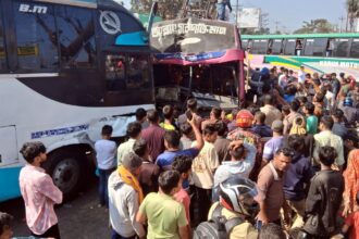 ফকিরহাট প্রতিনিধি : বাগেরহাটের ফকিরহাটে দুটি যাত্রীবাহী বাসের সাথে মূখোমূখি সংঘর্ষের ঘটনায় নারীসহ ১৫ জন আহত হয়েছেন। খুলনা-ঢাকা মহাড়কের ফকিরহাট বিশ্বরোড মোড় এলাকায় এ দুর্ঘটনা ঘটে। পুলিশ জানায়, রবিবার (১৫ ফেব্রূয়ারি) সকাল ১০টার দিকে ঢাকা থেকে ছেড়ে আসা বিএম লাইন পরিবহন খুলনার দিকে যাচ্ছিল। এসময় খুলনা থেকে ছেড়ে আসা মাদারীপুরগামী রূপসী বাসটি ফকিরহাট এসে পৌছালে নিয়ন্ত্রণ হারিয়ে ওই বাসের সাথে সংঘর্ষের ঘটনা ঘটে। ঘটনার পর পৌনে এক ঘন্টার মত যানবাহন চলাচল বন্ধ ছিল। আহতরা হলেন ব্যাংক কর্মকর্তা মানবেন্দ্র নারায়ন সরকার (৪৫), নাছিমা বেগম (৬০), শিল্পী মন্ডল ((৪০), রাজিয়া বেগম (৫০), সোনিয়া আক্তার (৩৫), নিরঞ্জন কুমার দাশ (৫০), হালিমা বেগম (৪২), মিনতী রানী ঢালী (৪০), কপিল রায় (৩৫) সহ ১৫জন আহত হয়েছেন। বাগেরহাট ফায়ার সার্ভিস এন্ড সিভিল ডিফেন্স এর উপ-সহকারী পরিচালক মো: বজলুর রহমান জানান, খবর পেয়ে ফকিরহাট ফায়ার সার্ভিসের একটি দল তাৎক্ষনিক ঘটনাস্থলে এসে আহতদের উদ্ধার করে উপজেলা স্বাস্থ্য কমপ্লেক্সে নিয়ে ভর্তি করে। আহতদের মধ্যে ৬জন নারী ও ৯জন পুরুষ রয়েছে। আহতরা বেশীরভাগ যাত্রী রূপসী বাসের বলে তিনি জানান। মোল্লাহাট হাইওয়ে থানার ভারপ্রাপ্ত কর্মকর্তা (ওসি) মো: আসাদুজ্জামান হাওলাদার বলেন, পুলিশ ঘটনাস্থলে উপস্থিত হয়ে পরিস্থিতি নিয়ন্ত্রণে আনে। দুই বাসের সামনের অংশ দুমড়ে-মুচড়ে গেছে। বাস দুটিকে সড়কের উপর থেকে সরিয়ে নেয়া হয়েছে। তবে রুপসী বাসের ব্রেক ফেল করার কারণে নিয়ন্ত্রণ হারিয়ে এ ঘটনা ঘটতে পারে।