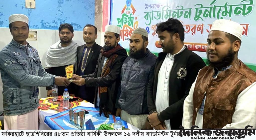 ফকিরহাট প্রতিনিধি : বাগেরহাটের ফকিরহাটে ছাত্রশিবিরের ৪৮তম প্রতিষ্ঠা বার্ষিকী উপলক্ষে ১৬ দলীয় ব্যাডমিন্টন টুর্নামেন্টের পুরস্কার বিতরণ অনুষ্ঠান অনুষ্ঠিত হয়েছে।