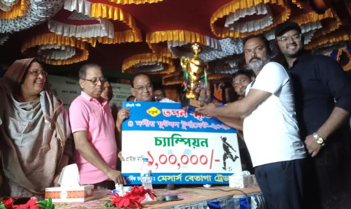 ফকিরহাট প্রতিনিধি : ফকিরহাটের বেতাগায় স্বর্গীয় তপন স্মৃতি ফুটবল টুর্নামেন্টে চ্যাম্পিয়ন হয়েছে বিসমিল্লাহ ফিড মিলস লি: একাদশ। খুলনা জেলার রুপসা উপজেলার ঐতিহ্যবাহী ফুটবল স্পোর্টিং ক্লাব মনসুর স্মৃতি সংসদকে ফাইনালে ৪-২ গোলে পরাজিত করে চ্যম্পিয়ন হয় দলটি। উপজেলার বেতাগা ইউনাইটেড মাধ্যমিক বিদ্যালয় ফুটবল ময়দানে দিনব্যাপী চারদলীয় এ ফুটবল টুর্নামেন্ট অনুষ্ঠিত হয়। শনিবার (২৪ ফেব্রুয়ারী) সকাল দশটায় জাতীয় সংগীত গেয়ে বেলুন ও কবুতর উড়িয়ে এ টুর্নামেন্টের উদ্বোধন করেন ফকিরহাট উপজেলা পরিষদের চেয়ারম্যান স্বপন দাশ। উদ্বোধনী অনুষ্ঠানে সভাপতিত্ব করেন সাবেক কৃতি ফুটবলার হৃষিকেশ দাশ। মেসার্স বেতাগা ট্রেডার্স এর সার্বিক তত্ত্বাবধানে এ ফুটবল টুর্নামেন্টের ১ম পর্বের খেলায় মনসুর স্মৃতি সংসদ খড়রিয়া স্পোর্টিং ক্লাবকে এবং বিসমিল্লাহ ফিড মিলস লি: একাদশ মুলঘর নবীন সংঘকে পরাজিত করে ফাইনালে উন্নীত হয়। খেলা শেষে চ্যাম্পিয়ন ও রানার্সআপ দলের হাতে ট্রফি ও প্রাইজমানি হিসেবে যথাক্রমে নগদ এক লক্ষ ও পঞ্চাশ হাজার টাকা তুলে দেন অনুষ্ঠানের প্রধান অতিথি ফকিরহাট উপজেলা পরিষদের চেয়ারম্যান স্বপন দাশ।