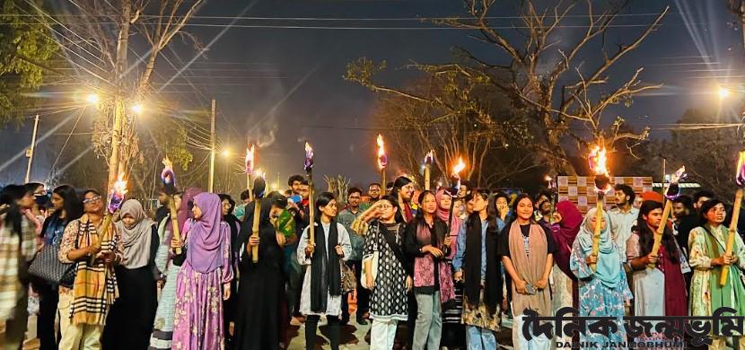 মিছিলে অংশগ্রহণকারীরা মশাল হাতে নিয়ে "ধর্ষকদের ঠিকানা এই বাংলায় হবে না", "ছিনতাইকারীর ঠিকানা এই বাংলায় হবে না", "নিরাপত্তা চাই, নিরাপদ বাংলাদেশ চাই", "ধর্ষকের সর্বোচ্চ শাস্তি চাই", "ছিনতাই-ডাকাতি বন্ধ করো, বন্ধ করো", জননিরাপত্তা নিশ্চিত করো"—এমন স্লোগান দেন। শিক্ষার্থীদের দাবি, নারীদের নিরাপত্তা নিশ্চিত করা, অপরাধীদের দ্রুত বিচারের আওতায় আনা এবং সামগ্রিক আইনশৃঙ্খলা পরিস্থিতির উন্নতি ঘটানো এখন সময়ের দাবিতে পরিণত হয়েছে।