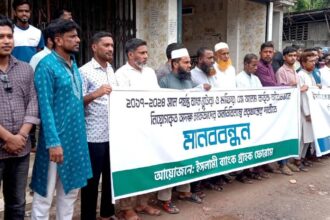 ফকিরহাট প্রতিনিধি : ইসলামী ব্যাংকসহ ব্যাংকিং খাতে বিশেষ অঞ্চলের একচ্ছত্র অবৈধ নিয়োগ বাতিল করে মেধাভিত্তিক নিয়োগের দাবীতে বাগেরহাটের ফকিরহাটে মানবন্ধন ও বিক্ষোভ অনুষ্ঠিত হয়েছে। সোমবার (৬ অক্টোবর) বেলা ১১টায় ইসলামী ব্যাংক বাংলাদেশ পিএলসি ফকিরহাট শাখা কার্যালয়ের সামনে বৈষম্যবিরোধী চাকুরী প্রত্যাশী পরিষদ ও ইসলামী ব্যাংক গ্রাহক পরিষদ এই মানববন্ধন ও বিক্ষোভ কর্মসূচির আয়োজন করেন। ইসলামী ব্যাংক গ্রাহক পরিষদের পক্ষে বক্তব্য রাখেন মাও: হাবিবুল্লাহ, মো: মিজানুর রহমান, মো: আব্দুল্লাহ সহ বৈষম্যবিরোধী চাকুরী প্রত্যাশী পরিষদের পক্ষে বক্তব্য রাখেন মো মোস্তাফিজুর রহমান প্রমূখ। মানববন্ধনে বক্তারা বলেন, ২০১৭-২০২৪ সাল পর্যন্ত ব্যাংক এস আলম গ্রুপ কর্তৃক অবৈধভাবে নিয়োগকৃত অদক্ষ কর্মকর্তাদের অনতিবিলম্বে ছাটাই করে মেধাভিত্তিক নিয়োগ দিতে হবে। ইসলামী ব্যাংক বাংলাদেশ পিএলসি’র ফকিরহাট শাখার এসিস্ট্যান্ট ভাইস প্রেসিডেন্ট মো: রহমত উদ্দিন হাওলাদার বলেন, ২০১৭-২০২৪ সাল পর্যন্ত এস আলম গ্রুপ ইসলামী ব্যাংকের কর্তৃত্ব নিয়েছিল। সে সময় বিজ্ঞাপন ও পরীক্ষা ছাড়াই অনেক মানুষকে ব্যাংকে নিয়োগ দিয়েছিল। যে কারনে ব্যাংকে অযোগ্য ও অদক্ষ লোকের সংখ্যা বেড়ে গেছে। বৈষম্যবিরোধী চাকুরী প্রত্যাশী পরিষদ ও ইসলামী ব্যাংক গ্রাহক পরিষদের উদ্যোগে আয়োজিত মানববন্ধনে যে দাবী জানিয়েছেন তা যোত্তিক দাবী বলে তিনি মনে করেন।