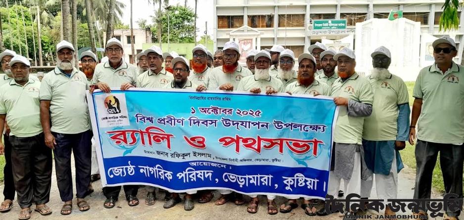 ভেড়ামারা প্রতিনিধি : কুষ্টিয়ার ভেড়ামারা উপজেলা জ্যেষ্ঠ নাগরিক পরিষদের উদোগে বুধবার বেলা ১১টার সময় উপজেলা চত্বরে আন্তর্জাতিক প্রবীণ দিবস উপলক্ষে আলোচনা সভা, র্যালি, নগদ অর্থ প্রদান ও দোয়া অনুষ্ঠিত হয়। সারা বিশ্বের মতো বাংলাদেশেও ‘আন্তর্জাতিক প্রবীণ দিবস পালিত হয়। এ বারের প্রতিপাদ্য বিষয় হলো “একদিন তুমি পৃথিবী গড়েছো, আজ আমি স্বপ্ন গড়বো, সযত্নে তোমায় রাখবো আগলে”। ভেড়ামারা উপজেলা জ্যেষ্ঠ নাগরিক পরিষদের সভাপতি বিশিষ্ট ব্যবসায়ী আমিনুল ইসলাম খোকন সভাপতিত্বে বক্তব্য রাখেন, ভেড়ামারা উপজেলা জ্যেষ্ঠ নাগরিক পরিষদের সাধারণ সম্পাদক গোলাম মোস্তফা, যুগ্ন সাধারন সম্পাদক খাদেমুল ইসলাম, মোলায়েম হোসেন, অর্থ সম্পাদক হাজী মকবুল হোসেন, ক্রীড়া সম্পাদক মোস্তাফিজুর রহমান বাবু, সিনিয়র উপদেষ্টা জৈয়মুদ্দিন আহমেদ, ধর্মীয় সম্পাদক হাফেজ মাওলানা আনোয়ার হোসেন, সমাজ কল্যাণ সম্পাদক হায়দার আলী প্রমুখ। আলোচনা ও র্যালী শেষে জ্যেষ্ঠ নাগরিকদের পক্ষ থেকে অসহায়দের মধ্যে সহযোগিতা প্রদান করেন। অনুষ্ঠান শেষে দোয়া পরিচালনা করেন, ধর্মীয় সম্পাদক হাফেজ মাওলানা আনোয়ার হোসেন।