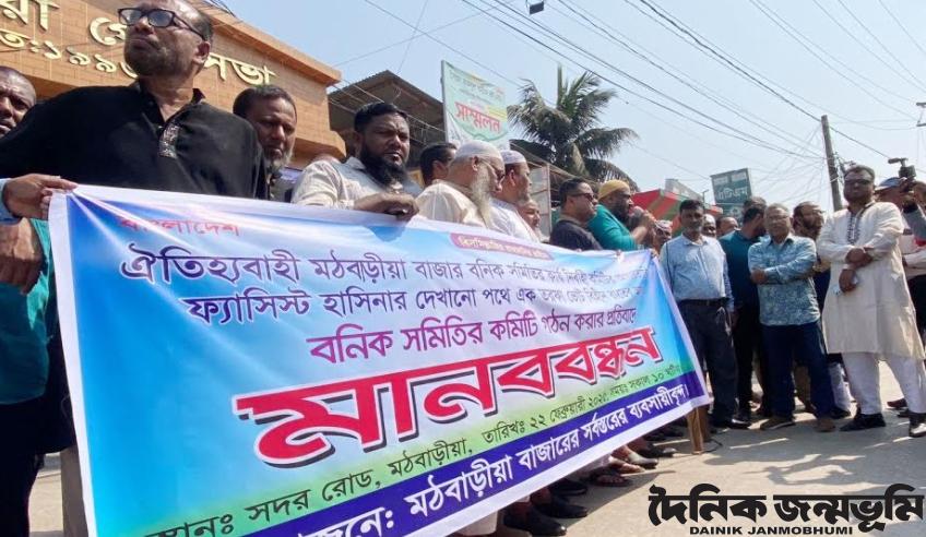 ঘন্টাব্যাপী মানববন্ধনে বাজারের প্রায় পাঁচশতাধিক ব্যবসায়িরা অংশ গ্রহণ করেন। এসময় ব্যবসায়ি শামসুল আহসন খোকার সভাপতিত্বে বক্তব্য রাখেন মঠবাড়িয়া পৌর বিএনপির আহবায়ক হুমায়ুন কবির, বিএনপি নেতা নিজামুল কবির মিরাজ, সাবেক ছাত্রনেতা মাহবুবুল আলম নান্না, উপজেলা যুবদলের আহবায়ক মাসুম বিল্লাহ, উপজেলা যুবদলের যুগ্ম আহবায়ক রিপন মু্িন্স, ব্যবসায়ী জাকির খান, আবুল কালাম আজাদ সাবু, রতন কর্মকার, মোঃ খলিলুর রহমান ও ওয়ালিউল ইসলাম তুষার, প্রমুখ। বক্তরা বলেন প্রকৃত ব্যবসায়ীদের বাদ দিয়ে আওয়ামী লীগ-জামায়াত মিলিয়ে রাতের আঁধারে ২৯ সদস্য বিশিষ্ট মঠবাড়িয়া বাজার বনিক সমিতির একটি কমিটি ঘোষণা করেন।