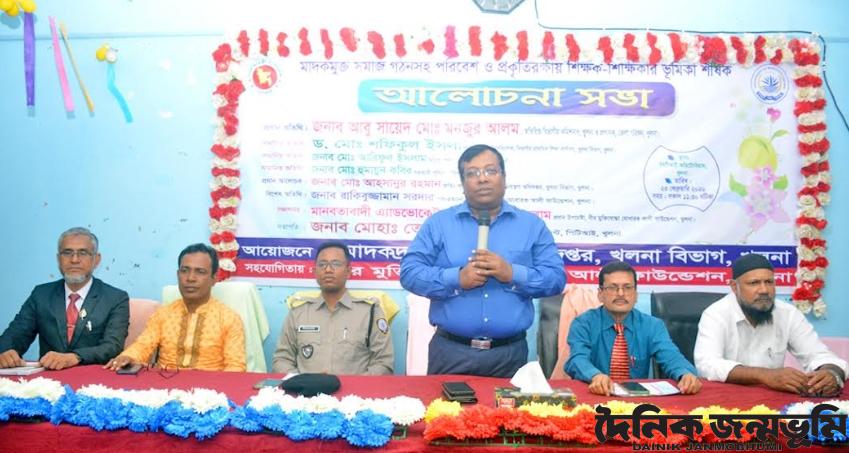 তথ্যবিবরণী : ‘মাদকমুক্ত সমাজ গঠনসহ পরিবেশ ও প্রকৃতিরক্ষায় শিক্ষক-শিক্ষিকার ভূমিকা শীর্ষক’ আলোচনা সভা আজ সোমবার খুলনা পিটিআই অডিটোরিয়ামে অনুষ্ঠিত হয়। সভায় প্রধান অতিথি ছিলেন অতিরিক্ত বিভাগীয় কমিশনার (সার্বিক) আবু সায়েদ মো: মনজুর আলম। বীর মুক্তিযোদ্ধা মোবারক আলী ফাউন্ডেশনের সহযোগিতায় খুলনা মাদকদ্রব্য নিয়ন্ত্রণ অধিদপ্তর এ অনুষ্ঠানের আয়োজন করে।