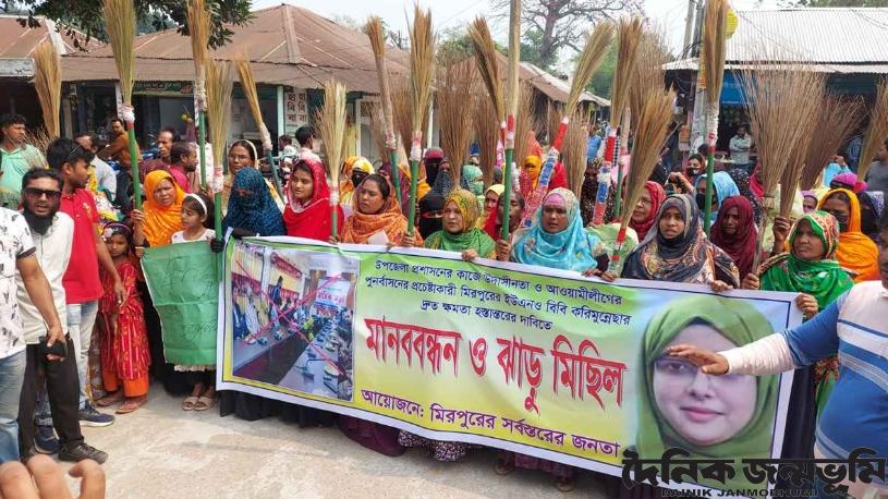 বৃহস্পতিবার (২৭ ফেব্রুয়ারি) সকাল ১১টার দিকে ‘মিরপুরের সর্বস্তরের জনতা’র ব্যানারে শহরের ঈগল চত্বর থেকে ঝাড়ু মিছিল বের হয়ে উপজেলা পরিষদের সামনে বিক্ষোভ সমাবেশ করে। এর আগে ঝাড়ু মিছিলে অংশ নেন এলাকার অনেক নারী-পুরুষ। সমাবেশে বক্তারা বলেন, ইউএনও বিবি করিমুন্নেছা মিরপুরে যোগদানের পর থেকে ক্ষমতার অপব্যবহার করে আসছেন। সম্প্রতি আওয়ামী লীগের পদধারীদের নিয়ে উপজেলা পরিষদ চত্বরে মিটিং করেছেন। তিনি আওয়ামী লীগকে পুনর্বাসন করার চেষ্টা করছেন। তাকে মিরপুর থেকে বদলি করা হয়েছে। তবুও এখন পর্যন্ত ক্ষমতা হস্তান্তর করেনি। বক্তারা জেলা প্রশাসকের দৃষ্টি আকর্ষণ করে আজকের (বৃহস্পতিবার) মধ্যে ইউএনওকে মিরপুর থেকে অপসারণ না করলে আগামী রোববার তালাবদ্ধ করে রাখার ঘোষণাও দেন।