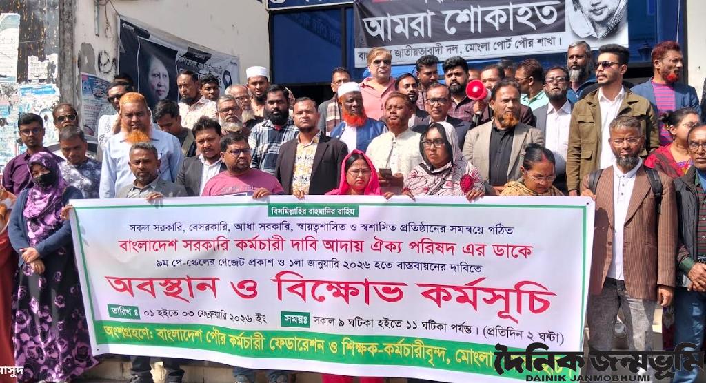 মোংলা প্রতিনিধি : ৯ম পে স্কেলের গেজেট প্রকাশ সহ ১লা জানুয়ারি থেকে বাস্তবায়নের দাবিতে মোংলায় পৌর কর্মচারী ও শিক্ষকদের অবস্থান কর্মসূচি পালিত হয়েছে। এ দাবি বাস্তবায়নে বাংলাদেশ পৌর কর্মচারী ফেডারেশন ও শিক্ষকবৃন্দ যৌথভাবে মোংলায় এ অবস্থান কর্মসূচি পালন করেন।