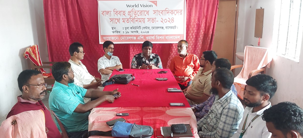 মোরেলগঞ্জ প্রতিনিধি : বাগেরহাটের মোরেলগঞ্জে বেসরকারি উন্নয়ন সংস্থা ওয়ার্ল্ডভিশনের উদ্যোগে বাল্য বিবাহ প্রতিরোধে সাংবাদিকদের সাথে এক মতবিনিময় সভা অনুষ্ঠিত হয়েছে।