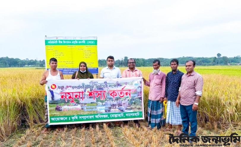 মোল্লাহাট (বাগেরহাট) প্রতিনিধিঃ বাগেরহাটের মোল্লাহাটে ব্রি ধান ১০৫ ধানের নমুনা শস্য কর্তন অনুষ্ঠিত হয়েছে। উপজেলা কৃষি সম্প্রসারণ অধিদপ্তরের আয়োজনে, প্রোগ্রাম অন এগ্রিকালচারাল এন্ড রুরাল ট্রান্সফরমেশন ফর নিউট্রিশন, এন্টারপ্রেনারশীপ এন্ড রেসিলিয়েন্স (পার্টনার) ইন বাংলাদেশ প্রকল্পের আওতায়, মঙ্গলবার (৬ মে) সকালে আটজুড়ী ইউনিয়নের ভান্ডারখোলা ব্লকের কদমতলা গ্রামের রিজিয়া বেগমের প্রদর্শনী ক্ষেতে রোপন করা উক্ত ধানের নমুনা কর্তন করা হয়। এ সময় উপস্থিত ছিলেন উপজেলা কৃষি অফিসার অনিমেষ বালা, অতিরিক্ত কৃষি অফিসার মেহেদী হাসান, এসপিপিও মোঃ আজিজুর রহমান ও ভান্ডারখোলা ব্লকের উপ সহকারী কৃষি কর্মকর্তা ও স্থানীয় কৃষক বৃন্দ। উপজেলা কৃষি অফিসার জানান, ব্রি ধান ১০৫ একটি নতুন জাতের ধান, এর ফলন ও খুব ভালো, প্রতি হেক্টরে ৭.৭৫ মেট্রিক টন ধান উৎপাদন করা সম্ভব হয়। মোল্লাহাটে এ বছর ৬টি প্রদর্শনী ক্ষেতে এ ধান রোপন করা হয়েছে, কৃষকরা ভালো ফলন পেয়ে তাদের মধ্যে এ ধান চাষে আগ্রহ বাড়ছে।