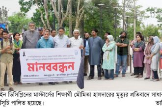 সড়ক দুর্ঘটনায় খুলনা বিশ্ববিদ্যালয়ের আইন ডিসিপ্লিনের মাস্টার্সের শিক্ষার্থী মৌমিতা হালদারের মৃত্যুর প্রতিবাদে সাধারণ শিক্ষার্থীদের উদ্যোগে মানববন্ধন কর্মসূচি পালিত হয়েছে। আজ ৩১ মার্চ (মঙ্গলবার) দুপুর ১টায় বিশ্ববিদ্যালয়ের হাদী চত্বরে এ কর্মসূচি অনুষ্ঠিত হয়।