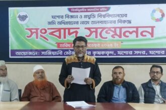 যশোর প্রতিনিধি : যশোর বিজ্ঞান ও প্রযুক্তি বিশ্ববিদ্যালয় (যবিপ্রবি) সম্প্রসারণের জন্য জমি অধিগ্রহণকে কেন্দ্র করে পূর্ব প্রতিশ্রুতি ভঙ্গের অভিযোগ তুলেছেন সাজিয়ালী মৌজার ক্ষতিগ্রস্ত কৃষকরা। মঙ্গলবার প্রেসক্লাব যশোর মিলনায়তনে এক সংবাদ সম্মেলনে তারা এই অভিযোগ করেন। কৃষক আব্দুল্লাহ আল মাহমুদ লিখিত বক্তব্য পাঠ করেন।