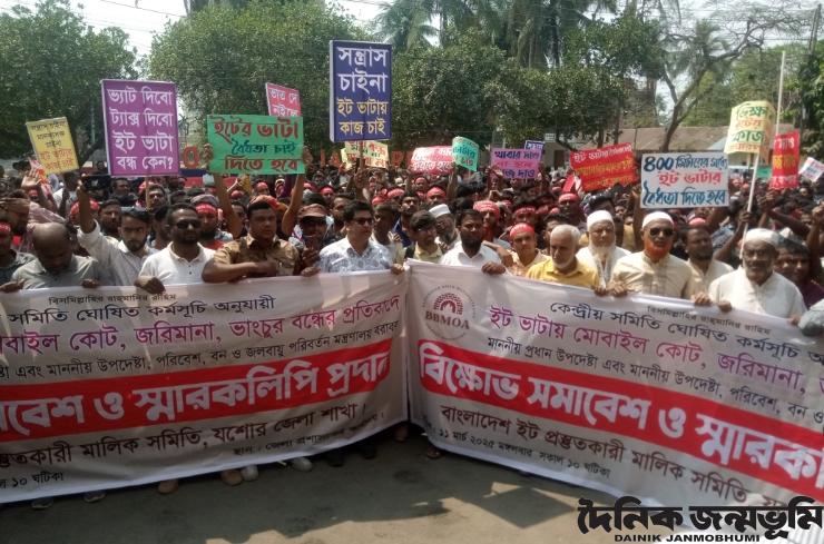 যশোর অফিস : যশোরে ইটভাটা মালিক ও শ্রমিকদের উদ্যোগে বিক্ষোভ মিছিল অনুষ্ঠিত হয়েছে। মঙ্গলবার (১১ মার্চ) বাংলাদেশ ইট প্রস্তুতকারী মালিক সমিতি যশোর জেলা শাখার উদ্যোগে এ কর্মসূচি পালিত হয়। পরে জেলা প্রশাসক আজহারুল ইসলামের কাছে স্মারকলিপি প্রদান করেন ইটভাটা মালিক ও শ্রমিকরা।