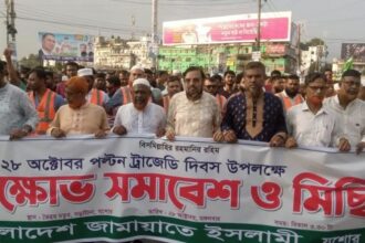 মঙ্গলবার বিকেল ৪টায় যশোর দড়াটানা ভৈরব চত্বরে বাংলাদেশ জামায়াতে ইসলামী যশোর জেলা শাখার উদ্যোগে এ কর্মসূচি অনুষ্ঠিত হয়। জেলা সেক্রেটারি অধ্যাপক আবু জাফর সিদ্দিকীর সভাপতিত্বে অনুষ্ঠিত সমাবেশে সদর উপজেলা ও আশপাশের এলাকা থেকে প্রায় পাঁচ শতাধিক নেতাকর্মী অংশ নেন।