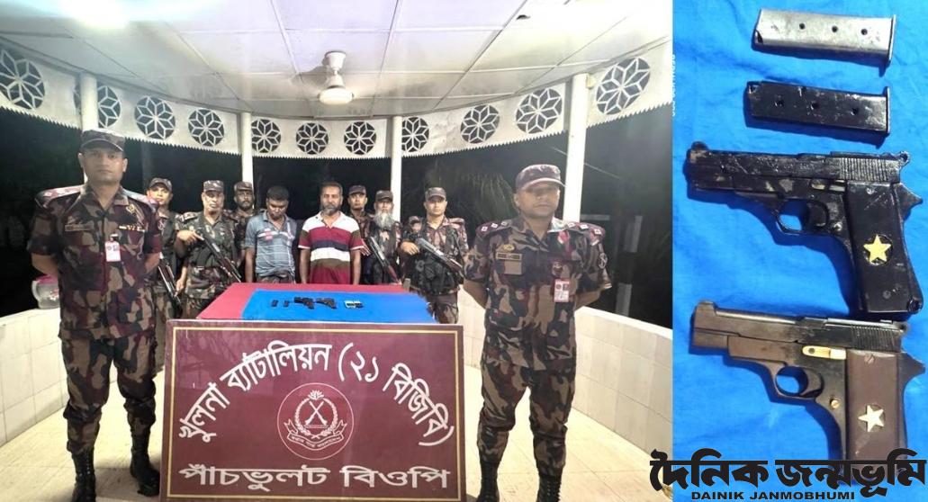 আটকদের কাছ থেকে ২টি ৯ এমএম পিস্তল (মার্কিন তৈরি), ২টি খালি ম্যাগাজিন এবং ২টি মোবাইল ফোন উদ্ধার করা হয়েছে।