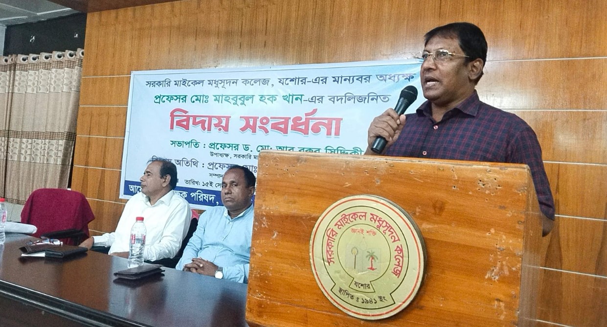 যশোর অফিস : যশোর সরকারি মাইকেল মধুসূদন কলেজের মান্যবর অধ্যক্ষ প্রফেসর মোঃ মাহবুবুল হক খানের বদলি জনিত কারণে সকালে শিক্ষক লাউঞ্জে 'এক বিদায় সংবর্ধনা' অনুষ্ঠানের আয়েজন করা হয়েছে। উক্ত অনুষ্ঠানের সভাপতিত্ব করেন কলেজের উপাধ্যক্ষ ড. মোঃ আবু বক্কর সিদ্দিকী।এসময় প্রধান অতিথি হিসেবে উপস্থিত ছিলেন শিক্ষক পরিষদের সাধারণ সম্পাদক প্রফেসর মোঃ আখতার হোসেন।এছাড়াও অন্যান্য বিভাগের বিভাগীয় প্রধান, শিক্ষকবৃন্দ এবং সাংবাদিকবৃন্দ উপস্থিত ছিলেন প্রফেসর মোঃ মাহবুবুল হক খান ৪ ঠা জুলাই সরকারি মাইকেল মধুসূদন কলেজের অধ্যক্ষ হিসেবে যোগদান করেছিলেন।মাত্র ৭৪ কার্যদিবসের পরিসমাপ্তির মধ্য দিয়ে তিনি নতুন কর্মস্থল মাধ্যমিক ও উচ্চ শিক্ষা অধিদপ্তর, ঢাকাতে বিশেষ ভারপ্রাপ্ত কর্মকর্তা হিসেবে যোগদান করবেন।এর আগে তিনি যশোর সরকারি মহিলা কলেজের রাষ্ট্রবিজ্ঞান বিভাগের বিভাগীয় প্রধান হিসেবে কর্মরত ছিলেন। তিনি তার বক্তব্যে বলেন _সরকারি মাইকেল মধুসূদন কলেজের শিক্ষার্থীরা তাঁকে সহযোগিতা করে গেছে বলেই দেশের খারাপ অবস্থায় তিনি কলেজে বৃক্ষরোপণ, টিউবওয়েল পুনরায় স্থাপণ, ডিজিটাল বোর্ড চালু করতে পেরেছিলেন। এছাড়াও কলেজের শিক্ষক এবং কর্মচারীবৃন্দও তাঁকে সার্বিকভাবে সহযোগিতা করে গিয়েছেন। পরবর্তীতে নতুন অধ্যক্ষ প্রফেসর ড. খন্দোকার এহসানুল কবিরের হাতে দায়িত্ব হস্তান্তর করেন।সর্বশেষে নতুন অধ্যক্ষ শিক্ষক লাউঞ্জে শিক্ষক পরিষদের শিক্ষকবৃন্দ এবং অন্যান্য শিক্ষকদের সাথে মত বিনিময়ের মধ্য দিয়ে অনুষ্ঠানের সমাপ্তি ষোঘণা করা হয়।