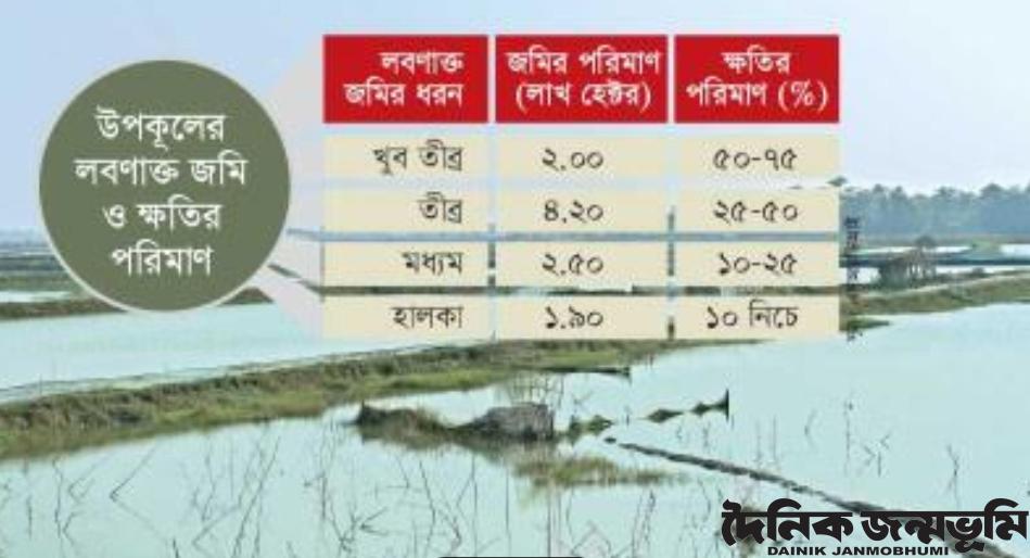 স্বাধীনতার পর ১৯৭৩ সালেও উপকূলীয় অঞ্চলে লবণাক্ত জমির পরিমাণ ছিল ৮ লাখ ৩৩ হাজার হেক্টর। বর্তমানে তা বেড়ে দাঁড়িয়েছে ১০ লাখ ৬০ হাজার হেক্টরে। সে হিসেবে গত চার যুগে উপকূলীয় অঞ্চলে লবণাক্ত জমির পরিমাণ বেড়েছে ২৭ শতাংশের বেশি। এর মধ্যে হালকা মাত্রায় লবণাক্ত জমির পরিমাণ ১ লাখ ৯০ হাজার হেক্টর, মধ্যম মাত্রায় ২ লাখ ৫০ হাজার, তীব্র মাত্রায় ৪ লাখ ২০ হাজার ও খুব তীব্র মাত্রায় লবণাক্ত জমির পরিমাণ ২ লাখ হেক্টর। উপকূলীয় অঞ্চলে এসব এলাকায় মোট আবাদি জমির পরিমাণ ২৮ লাখ ৩০ হাজার হেক্টর। এর মধ্যে চাষযোগ্য ২১ লাখ ৬২ হাজার হেক্টর। সে হিসেবে উপকূলীয় অঞ্চলের চাষযোগ্য জমির প্রায় অর্ধেকই লবণাক্ত। লবণ পানির ভয়াবহতার কারণে প্রতি বছর শুষ্ক মৌসুমে উপকূলীয় এলাকায় পাঁচ লাখ হেক্টরের বেশি জমি অনাবাদি থেকে যায়।
