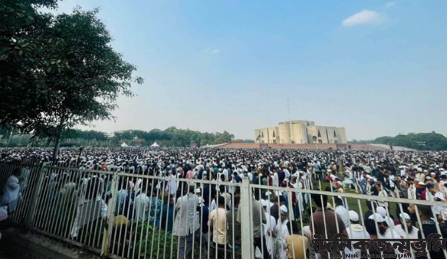 রাজধানী ঢাকা ছাড়াও দেশের বিভিন্ন জেলা থেকে জানাজায় অংশ নিতে ছুটে আসেন মানুষ। তারা বলছেন, এই জানাজায় সর্বকালের সর্বশ্রেষ্ঠ গণজমায়েত হয়েছে।