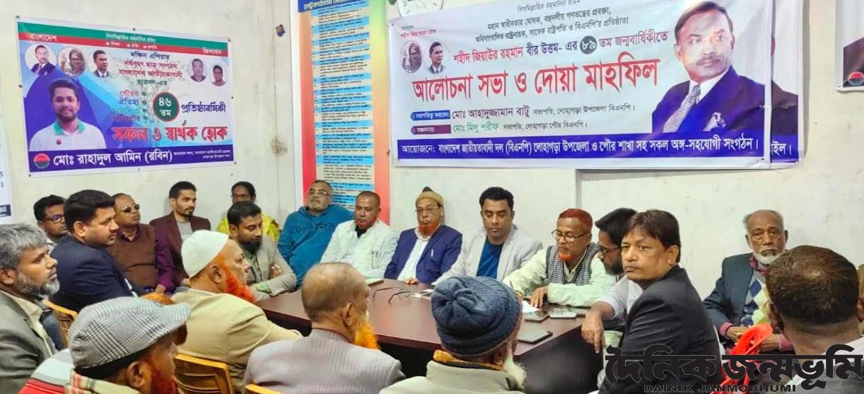 রবিবার (১৯জানুয়ারি) সকাল ১১ টায় লোহাগড়া উপজেলা বিএনপির কার্যালয়ে বাংলাদেশ জাতীয়তাবাদী দল লোহাগড়া ও পৌর শাখাসহ সকল অঙ্গ-সহযোগী সংগঠনের উদ্যোগে এ আলোচনা সভা ও দোয়া মাহফিল অনুষ্ঠিত হয়।