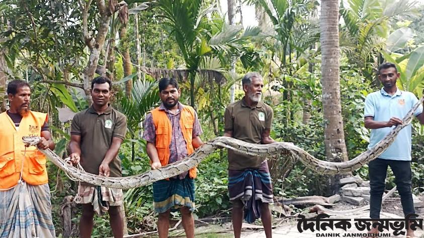 শেখ হাসান আল মাহমুদ, শরণখোলাঃ শরণখোলায় শুক্রবার বিকেলে সুন্দরবন সংলগ্ন সোনাতলা গ্রামের একটি বাগান থেকে ২০ ফুট লম্বা একটি অজগর উদ্ধার করা হয়েছে । অজগরটিন একটি ছাগল মেরে ফেলেছে। উদ্ধারকৃত অজগরটি শুক্রবার সন্ধ্যায় সুন্দরবনে অবমুক্ত করা হয়েছে। সোনাতলা গ্রামের কমিউনিটি প্যাট্রলিং গ্রুপ (সিপিজি) লিডার মোঃ খলিলুর রহমান জানান, গ্রামের মরিয়ম বেগমের একটি ছাগল খোজ করে না পেয়ে প্রতিবেশী মালেকের বাড়ির বাগানে বেলা ৩টার দিকে গিয়ে দেখেন বিশাল একটি অজগর তার বকরি ছাগলটিকে আক্রমন করে মেরে ফেলেছে এবং মৃত ছাগলটিকে পেচিয়ে ধরে রেখেছে। মরিয়ম বেগম এ দৃশ্য দেখে তাঁকে জানান। পরে তিনি তার সিপিজি সদস্য ও ভিটিআরটি সদস্যদের নিয়ে ঘটনাস্থলে যান। লোকজনের টের পেয়ে সাপটি ছাগলটিকে ছেড়ে দিয়ে পার্শবর্তী ঝোপের মধ্যে আশ্রয় নেয়। পরে তল্লাশী চালিয়ে তারা অজগরটিকে উদ্ধার করেন। ২০ ফুট লম্বা অজগরটির ওজন আনুমানিক ৫৫ কেজি। পূর্ব সুন্দরবন বিভাগের শরণখোলা ফরেষ্ট ষ্টেশন কর্মকর্তা মোঃ ফারুক হোসেন বলেন, সোনাতলা গ্রামের তজুরগেট এলাকার মালেকের বাড়ির বাগান থেকে উদ্ধার হওয়া অজগরটি বনরক্ষীদের সহায়তায় সিপিজি ও ভিটিআরটির সদস্যরা শুক্রবার সন্ধ্যায় শরণখোলা ষ্টেশন অফিস সংলগ্ন সুন্দরবনে বনে ছেড়ে দিয়েছে।