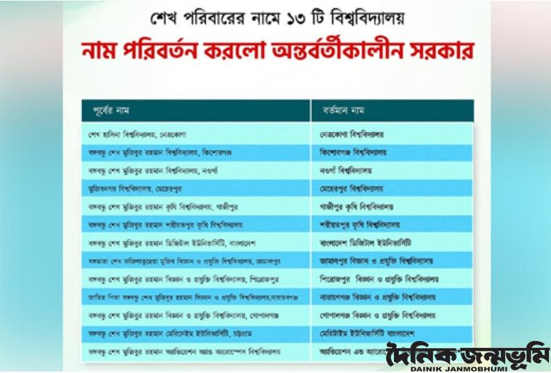 শিক্ষা মন্ত্রণালয় এসব বিশ্ববিদ্যালয়ের নাম পরিবর্তন করার জন্য বৃহস্পতিবার উপদেষ্টা পরিষদে উত্থাপন করলে তা পাস হয়।