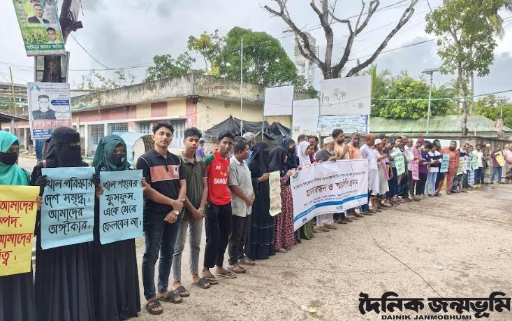 শ্যামনগর প্রতিনিধিঃ সাতক্ষীরার শ্যামগরে খালের ইজারা বাতিল, দখল মুক্ত এবং খাল পুনঃখননের দাবী নিয়ে ৬ ইউনিয়নের ৩শতাধিক স্থানীয়দের মানববন্ধন শেষে উপজেলা নিবার্হী অফিসার বরাবর স্মারকলিপি প্রদান করা হয়েছে। বুধবার (২৯ অক্টোবর) সকাল ১০টায় উপজেলা প্রেসক্লাব চত্বরে রমজাননগর ইউনিয়নের আটকাঠা খাল, কৈখালী ইউনিয়নের বড় মৌ কাঠলা খাল, ঈশ্বরীপুর ইউনিয়নের চরারচক খাল, ভুরুলিয়া ইউনিয়নের নিমতলার খাল, আটুলিয়া ইউনিয়নের নগরকাঠি খাল এবং বুড়িগোয়ালীনি ইউনিয়নের শিমনখালীর খাল নিয়ে মানববন্ধন করেন স্থানীয় জনগোষ্টী, সিডিও ইয়ুথ টিম, উপজেলা এডভোকেসি কমিটি এবং সুশীল সমাজের নেতৃবৃন্দ। জিফরসিআর প্রকল্পের সহযোগিতায় স্থানীয় জনগোষ্টী তাদের বক্তব্যে বলেন, আমাদের এলাকার গুরুত্বপূর্ন কয়েকটি খাল দীর্ঘদিন ধরে অবৈধ ভাবে দখল এবং অপরিকল্পিত ও জনস্বার্থের বিষয়টি বিবেচনা না করে স্থানীয় তহশিল অফিসের অসাধু কর্মকর্তাদের দ্বারা খালের শ্রেনী পরিবর্তন করে বিলের ফসলি জমির ভিতরের এবং বিল থেকে পানি নিষ্কাশনের খাল বন্দোবস্থ দেওয়ার ফলে আমাদের এলাকায় প্রায় প্রতি বছরই বৃষ্টির পানি জমে জলাদ্ধতা সৃষ্টি হচ্ছে। খাল ভরাট ও অবৈধ ভাবে দখল করে বাঁধ দেওয়ার কারণে জলাবদ্ধতার সৃষ্টি হয়ে অত্র এলাকার কৃষকদের আমন ধানের বীজতলা, সবজি ক্ষেত, বসত বাড়ির পুকুরের মাছ, মাছের ঘের, বসত বাড়ি ইত্যাদি ক্ষতিগ্রস্থ হয়ে থাকে।এছাড়া অত্র এলাকার মাটির গভীরের পানি লবণাক্ত হওয়ার কারণে শুধুমাত্র বর্ষা মৌসুমে বৃষ্টির পানিতে বছরে একটি মাত্র ফসল আমন ধান চাষ করা হয়ে থাকে। এক মাত্র মিষ্টি পানির আধার খাল এই খাল গুলো বন্দোবস্ত, ভরাট ও অবৈধ ভাবে দখল করে বাঁধ হওয়ার কারনে এবারের বর্ষা মৌসুমের অতিরিক্ত বৃষ্টিতে জলাবদ্ধতার সৃষ্টি হয়ে কৃষকরা ক্ষতি ও ভোগান্তিতে পড়েছে।