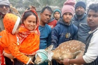 সাতক্ষীরা প্রতিনিধি : সাতক্ষীরার শ্যামনগর উপজেলার বুড়িগোয়ালিনী ইউনিয়নের আড়পাংশিয়া এলাকা থেকে একটি হরিণ উদ্ধার করা হয়েছে। মঙ্গলবার সকালে সুন্দরবন সংলগ্ন লোকালয়ে হরিণটি ঘোরাফেরা করতে দেখেন। প্রত্যক্ষদর্শীরা জানান, সুন্দরবন থেকে দিকভ্রান্ত হয়ে হরিণটি লোকালয়ে প্রবেশ করে। পরে স্থানীয়রা হরিণটিকে নিরাপদে আটক করে বন বিভাগের কাছে খবর দেন। খবর পেয়ে বন বিভাগের সদস্যরা ঘটনাস্থলে পৌঁছে হরিণটিকে উদ্ধার করেন। রেঞ্জার ফজলুল হক বলেন “উদ্ধারকৃত হরিণটি সুস্থ রয়েছে। প্রাথমিক চিকিৎসা ও পর্যবেক্ষণ শেষে হরিণটিকে পুনরায় সুন্দরবনের নিরাপদ এলাকায় অবমুক্ত করার প্রস্তুতি নেওয়া হচ্ছে।”এ বিষয়ে বন বিভাগের কর্মকর্তারা জানান, “প্রাকৃতিক পরিবেশের পরিবর্তন, নদী ভাঙন ও খাবারের সংকটের কারণে মাঝে মাঝে বন্যপ্রাণী লোকালয়ে চলে আসে। এ ধরনের ঘটনায় স্থানীয়দের সচেতনতা ও সহযোগিতা প্রশংসনীয়।”