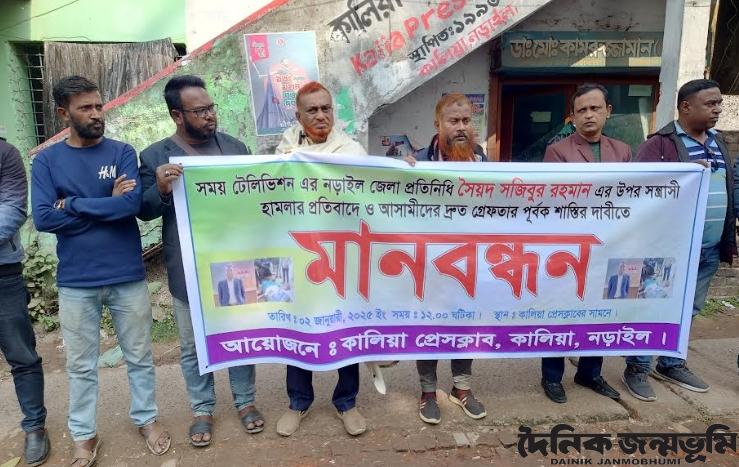 বৃহস্পতিবার(২ জানুয়ারি )বেলা ১২ টার দিকে কালিয়া প্রেসক্লাবের সামনে, কালিয়ার উপজেলার সাংবাদিকবৃন্দের আয়োজনে ঘণ্টাব্যাপি এ মানববন্ধন অনুষ্ঠিত হয়।