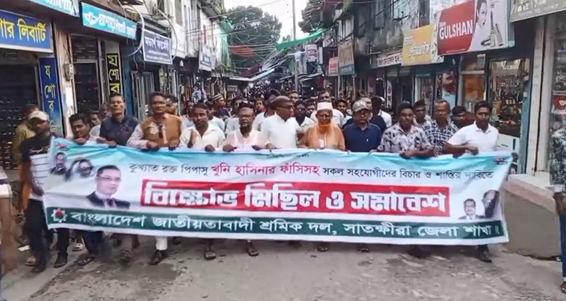 সাতক্ষীরা প্রতিনিধি : খুনি হাসিনার ফাঁসিসহ তার সকল সহযোগিদের বিচার ও শাস্তির দাবিতে সাতক্ষীরায় বিক্ষোভ মিছিল ও সমাবেশ অনুষ্ঠিত হয়েছে। জেলা শ্রমিক দলের আয়োজেন সোমবার বিকালে শহরের সংগীত মোড় থেকে বিক্ষোভ মিছিল বের হয়ে শহরের প্রধান প্রধান সড়ক প্রদক্ষিণ শেষে নিউমার্কেট মোড়ে গিয়ে সমাবেশে মিলিত হয়। জেলা শ্রমিক দলের সভাপতি আব্দুস সামাদের সভাপতিত্বে সমাবেশে প্রধান অতিথির বক্তব্য রাখেন, সাতক্ষীরা জেলা বিএনপির আহবায়ক এড. সৈয়দ ইফতেখার আলী।
