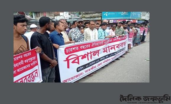 মঙ্গলবার (২৩ সেপ্টেম্বর '২৫) সাতক্ষীরা শহরের নিউমার্কেটের সামনে সাতক্ষীরা জেলা সম্মিলিত ব্যবসায়ী মহল ও সাতক্ষীরাবাসীর আয়োজনে প্রাক্তন মন্ত্রী ডা. আফতাবুজ্জামান এর সভাপতিত্বে মানববন্ধনে বক্তব্য রাখেন সাবেক জেলা শিক্ষা অফিসার কিশোরী মোহন সরকার, দৈনিক প্রথম আলো পত্রিকার নিজস্ব প্রতিবেদক কল্যাণ ব্যানার্জি, সাতক্ষীরা কেন্দ্রীয় পাবলিক লাইব্রেরির সাধারণ সম্পাদক মোঃ কামরুজ্জামান রাসেল, জেলা নাগরিক কমিটির যুগ্ম আহ্বায়ক আলি নুর খান বাবুল, উদীচী সাতক্ষীরা জেলা শাখার সভাপতি শেখ সিদ্দিকুর রহমান, সাতক্ষীরা জেলা ডেকোরেটর মালিক সমিতির কামরুজ্জামান কামু, সহ-সভাপতি গোলাম কুদ্দুস, হোটেল রেস্তোরাঁ ও বস্ত্র ব্যবসায়ী সমিতির জিল্লুর রহমান, বস্ত্র ব্যবসায়ী সমিতির মাসুম বিল্লাহ মিল্টন প্রমুখ।