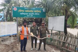 ডেস্ক রিপোর্ট : সুন্দরবন হতে লোকালয়ে আসা একটি অজগর সাপ উদ্ধার করে তা বনের মধ্যে অবমুক্ত করা হয়েছে। শুক্রবার (৩০ মে) সকাল ৮ টার দিকে কাশিয়াবাদ স্টেশন কর্মকর্তা মোঃ শফিকুল ইসলাম শাহিদের নেতৃত্বে অভিযান চালিয়ে সাপটি উদ্ধার করা হয়। এর আগে উপজেলার মঠবাড়ি গ্রামের আতিয়ার রহমান গাজীর বাড়িতে অজগর সাপটি স্থানীয়রা দেখতে পেয়ে বন বিভাগকে খবর দেয়। তাৎক্ষণিক বন কর্মিরা সহ ভিটিআরটি ও সিপিজি সদস্যরা ঘটনাস্থলে উপস্থিত হয়ে সাপটি উদ্ধার করে। সাপটি ৮ ফুট লম্বা ও ১০ কেজি ওজন ছিল। খুলনা রেঞ্জের সহকারি বন সংরক্ষক (এসিএফ) মোঃ শরিফুল ইসলাম বলেন, উদ্ধারকৃত অজগর সাপটি কাশিয়াবাদ স্টেশনের অধিনস্থ সত্যপিরের ভারানী এলাকায় অবমুক্ত করা হয়েছে।