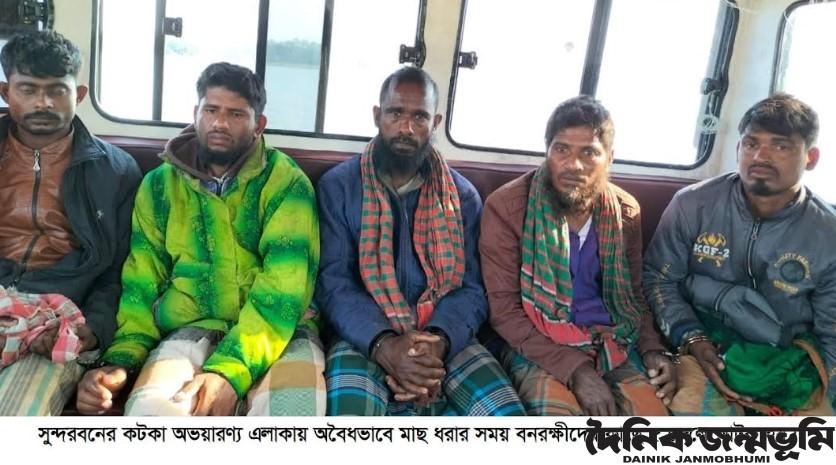 বনবিভাগ সূত্রে জানা যায়, রবিবার বিকেলে কটকা অভয়ারণ্যের দুধমুখি এলাকার খালে নিষিদ্ধ বেহুন্দি জাল দিয়ে অবৈধভাবে মাছ ধরার সময় কটকা অভয়ারণ্য কেন্দ্রের মোঃ হাবিবুর রহমান এর নেতৃত্বে বনরক্ষীরা ৫ জন জেলেকে একটি ট্রলারসহ আটক করতে সক্ষম হয়। আটককৃতরা হচ্ছে মোঃ মিরাজ (৫০), হানিফ মুন্সি (৫০), আল আমিন (৪০), মানিক কাজী (২৫) ও রফিক দেওয়ান (৫০)। আটককৃতদের বাড়ি বরগুনার পাথরঘাটা ্উপজেলার রুহিতা গ্রামের বলে বনরক্ষীরা জানিয়েছেন।