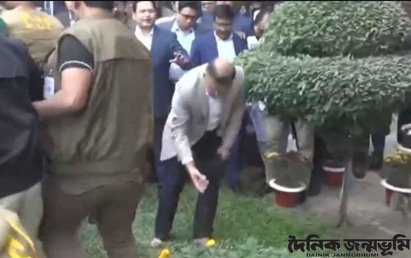 বৃহস্পতিবার (২৫ ডিসেম্বর) দুপুর সাড়ে ১২টার পর বিমানবন্দর থেকে বের হয়ে প্রথমে দুই পায়ের জুতা খোলেন। এরপর হাতে নেন এক মুঠো মাটি।