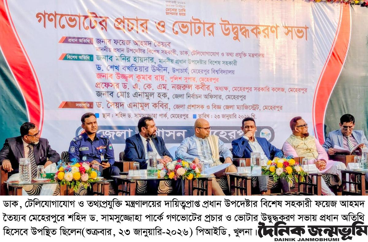 তিনি আজ (শুক্রবার) বিকালে মেহেরপুর জেলা প্রশাসনের আয়োজনে শহিদ ড. সামসুজ্জোহা পার্কে অনুষ্ঠিত গণভোটের প্রচার ও ভোটার উদ্বুদ্ধকরণ সভায় প্রধান অতিথির বক্তৃতায় একথা বলেন।