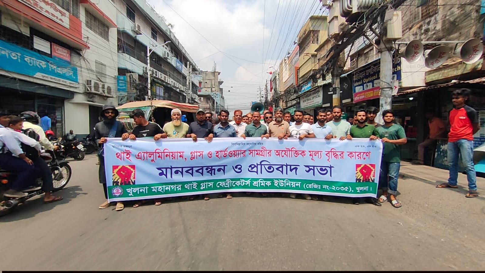 গত ৫ই ডিসেম্বর ২০২৫ তারিখে থাই গ্লাস, ফেব্রীকেটর্স পণ্যে ৮% এবং ১৫ ই মার্চ ২০২৬-এ ১৫%, সকল প্রকার গ্লাসের ওপর প্রায় ৩৪ শতাংশ সকল প্রকার হার্ডওয়ার পণ্যের উপর ১০ থেকে ১৫% মূল্যবৃদ্ধির প্রতিবাদে খুলনা মহানগর থাইগ্লাস ফেব্রীকেটর্স শ্রমিক ইউনিয়ন (রেজি নং ২০৩৫ ) সংগঠনটি ৭ দিনের আলটিমেটামে সকল পণ্যের দাম দ্রুত কমানোর জন্য জোর দাবি জানিয়ে মানববন্ধন ও প্রতিবাদ সভার আয়োজন করেন।