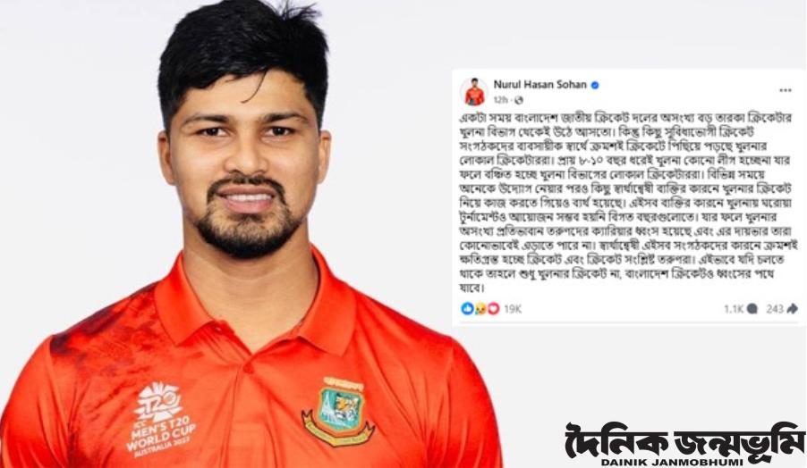 জাতীয় দলের বাইরে থাকা উইকেটরক্ষক এই ব্যাটার এক ফেসবুক পোস্টে ক্ষোভ উগরেছেন তার জেলা খুলনার ক্রিকেট নিয়ে। সেখানের অনিয়ম তুলে ধরে আশঙ্কা প্রকাশ করেছেন সোহান, ‘এমন চললে শুধু খুলনার ক্রিকেট না, বাংলাদেশ ক্রিকেটও ধ্বংসের পথে যাবে।’